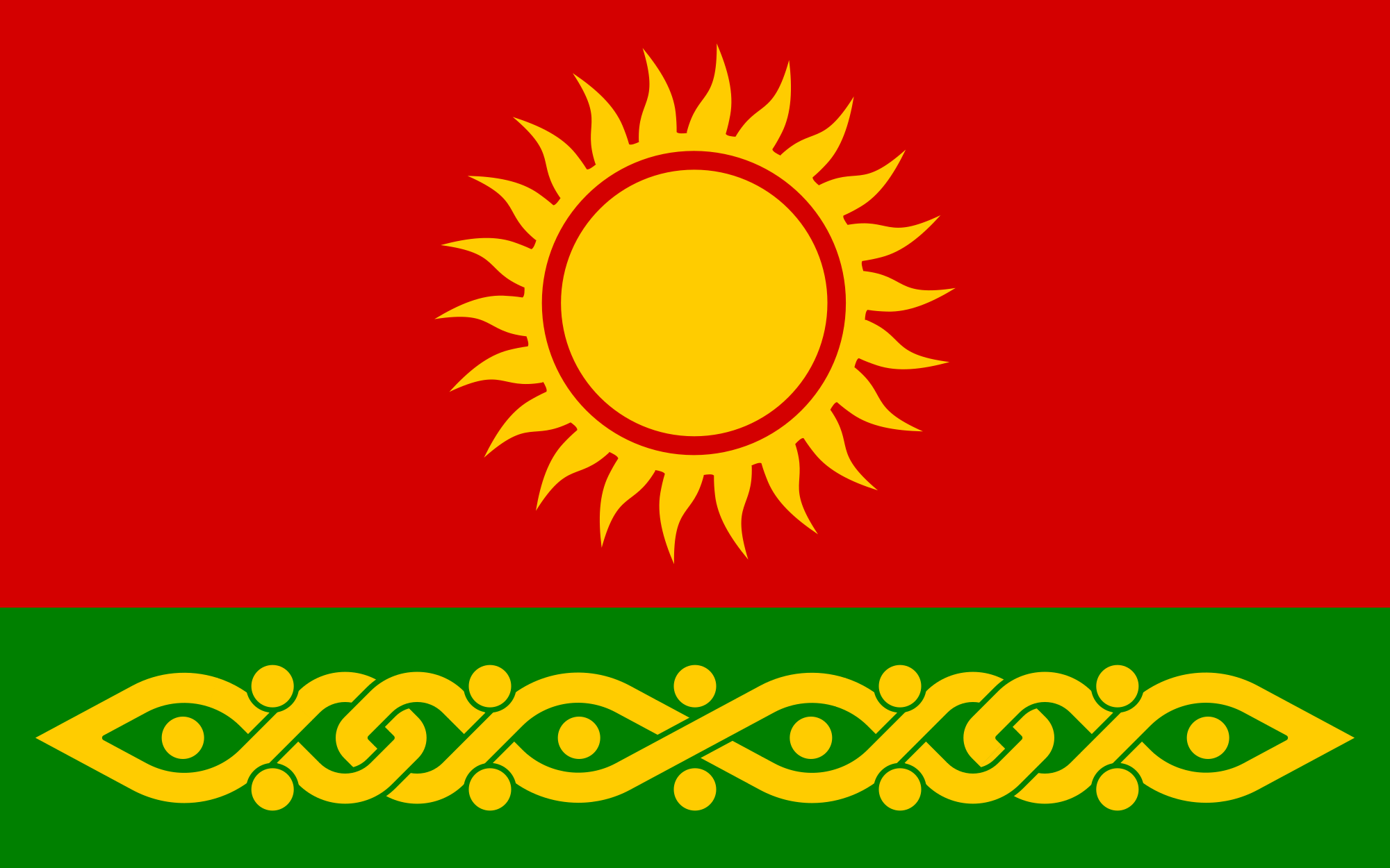 - czerwono-zielona flaga ze złotym wizerunkiem Słońca i złotym wizerunkiem Ornamentu Stepowego,